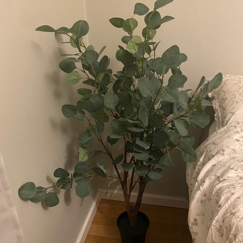 En stor glasflaska med rottingdetalj i botten ca 55 cm hög. Ingår några kvistar eukalyptus konstväxt. Fin att ha som dekoration.