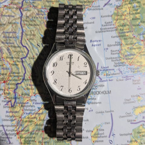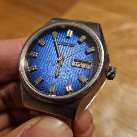 Citizen herrklocka med chronograph funktion. Klockan har en blå urtavla och ett armband i stål. Den har datumvisning. Urtavlan är märkt "Citizen WR 100 Chronograph".