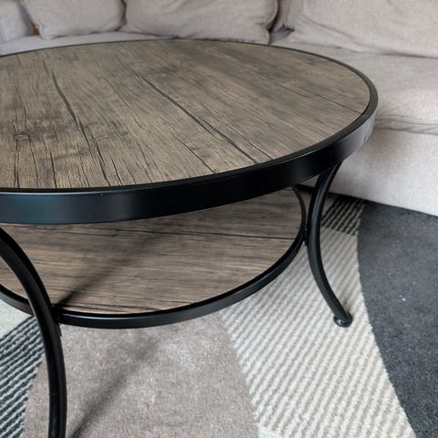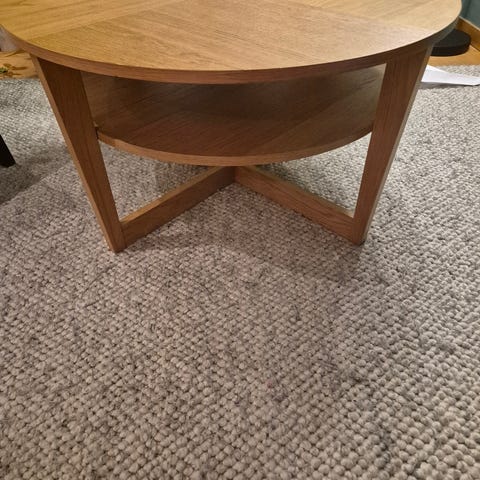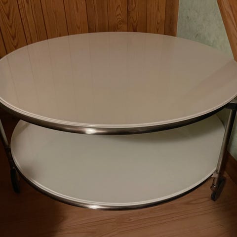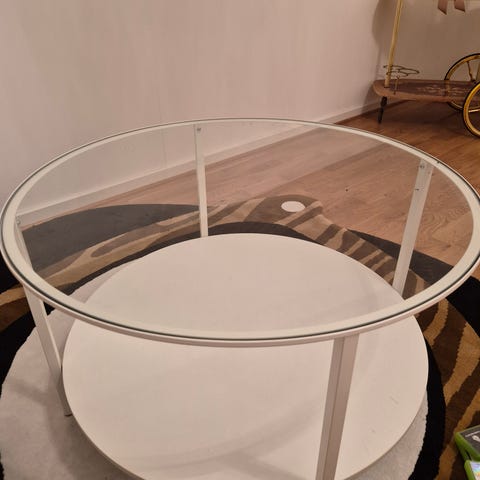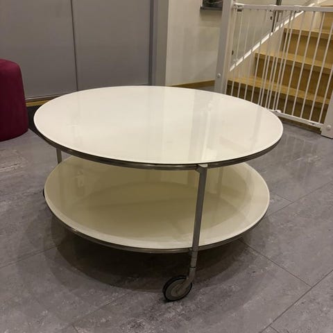 Runt soffbord på hjul med två vita glasskivor. Diameter 80 cm.