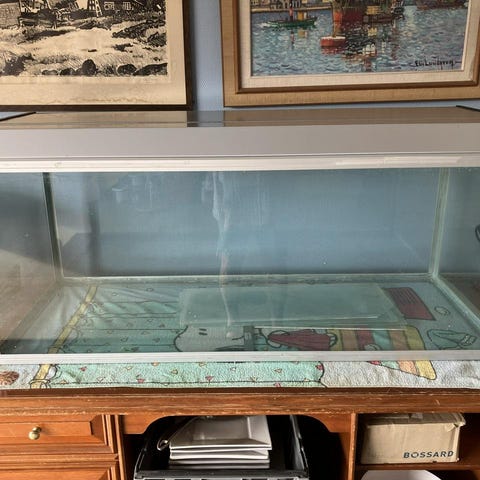 960l hel glas och svetsad ställning fått sig en liten kyss där det släppt knappt 1 mm glas alltså ingen spricka (glasmästare säger att det inte påverkar karet) har stått med vatten och igång 2 år utan några konstigheter