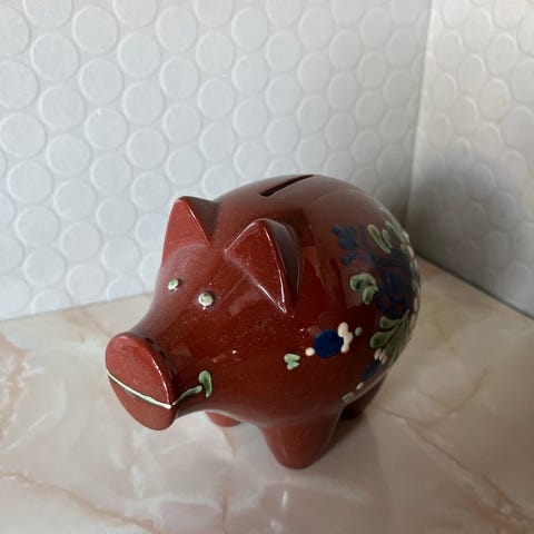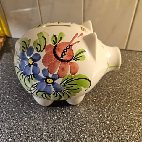 Säljer en mycket fin och stor spargris i keramik från Gabriel, ett välkänt svenskt märke. Spargrisen är dekorerad med ett vackert handmålat blommotiv i blått och grönt – både charmig som sparbössa och snygg som inredningsdetalj i hemmet. Perfekt till barnrummet, som present, eller för samlare av svensk keramik och retroföremål.