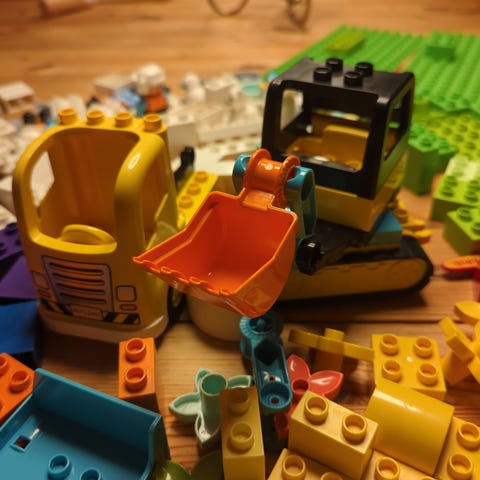Längst bak - en hel del duplo klossar - där många special - duplo klossar ingår - också några mindre duplo plattor