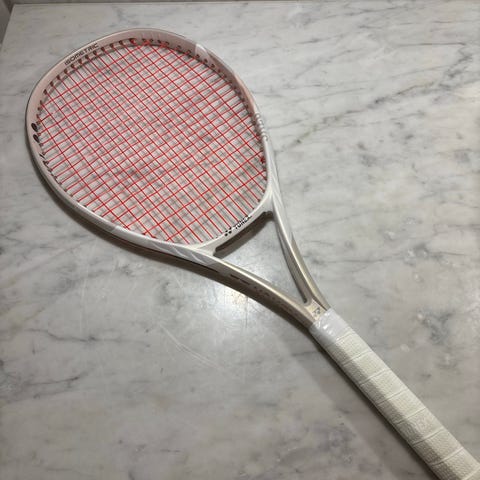 Yonex Vcore 100 tennisracket med huvudstorlek 100 kvadrattum, vikt 300 gram och balanspunkt på 320 mm. Racketen är beige och har strängning 16x19.