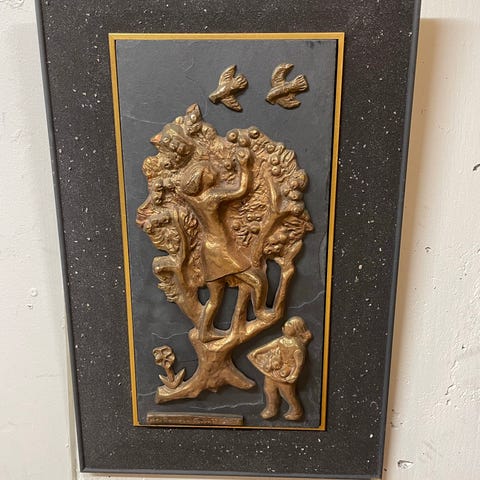 Tillverkad av tyskt gjuteri - Thomae 1967 gjuten metall relief med detaljerad design. Föremålet är tillverkat i metall och har en kvadratisk form med måtten cirka 20 cm x 20 cm. Relief föremålet föreställer figurer från mytologi med fina detaljer element i tredimensionell form.