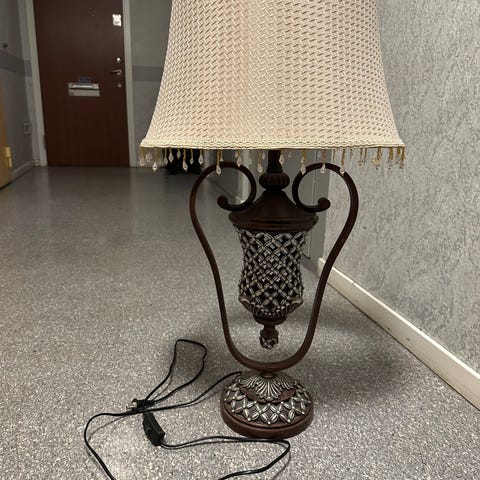 Bordslampa i mässing med tillhörande lampskärm med mönster och i en brun/ guldig ton.