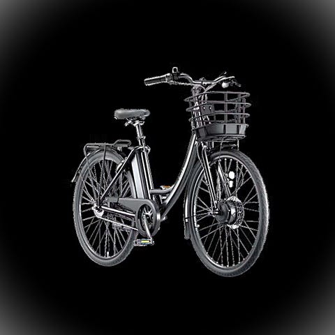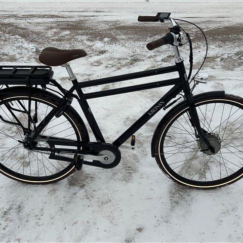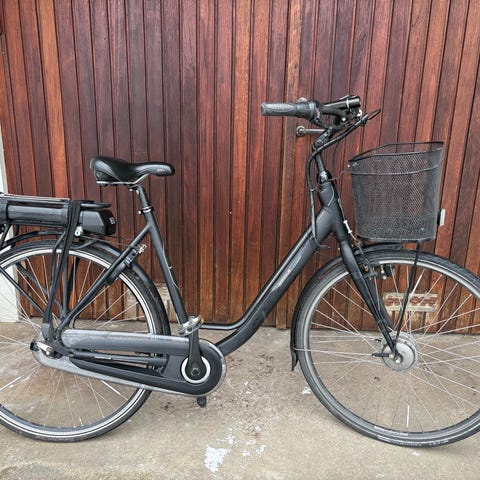 Svart elcykel utrustad med framkorg och bakre pakethållare med låda. Cykeln har ett digitalt display för hastighet och batteristatus. Passar för vardaglig pendling och transporter. Använd ca 1 år