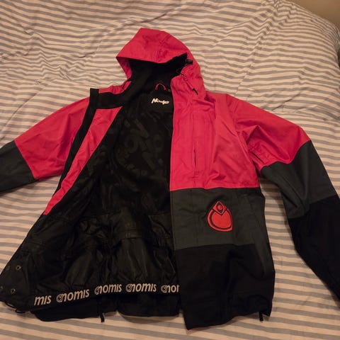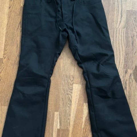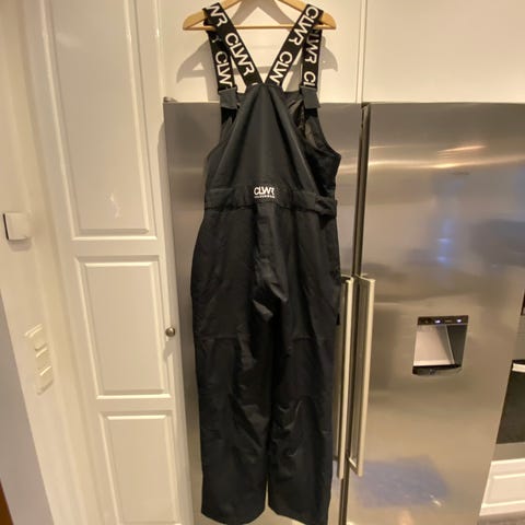 Byxorna har justerbara hängslen och flera fickor med dragkedjor. Snölås och blixtlås längs benet.