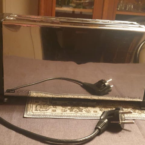Sandstrøm brödrost i rostfritt stål med 4 brödplatser och digital display för inställning av rostningsnivå. Piper när den är klar och bröden hissas upp så att de är lätta att ta ur utan att bränna sig. Säljs pga platsbrist.