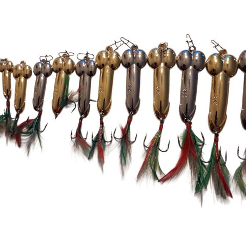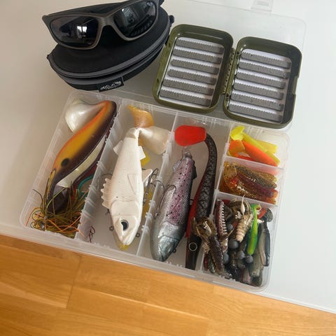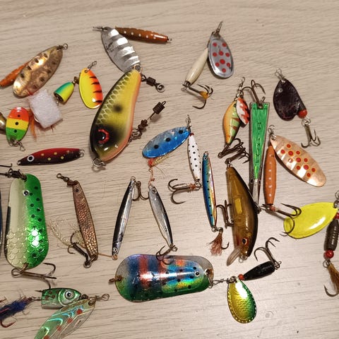 Set med olika fiskedrag i varierande modeller och färger. Innehåller bland annat drag med sked, wobblers och imitationer av grodor och ormar. Lämpliga för olika typer av fiske och målade i flera färger för att attrahera olika fiskarter.