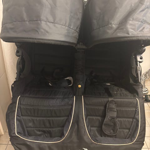 Baby Jogger Dubble barnvagn i svart färg. Barnvagnen är utformad för två barn och har separata sittplatser med suffletter. Den är utrustad med säkerhetsbälten och ett gemensamt handtag för styrning. Vagnen har fyra hjul och är anpassad för enkel hantering och transport av två barn samtidigt. Kan användas som resevagn också. Det finns lite slitage i mitten av sittplatserna , se sista bilden.