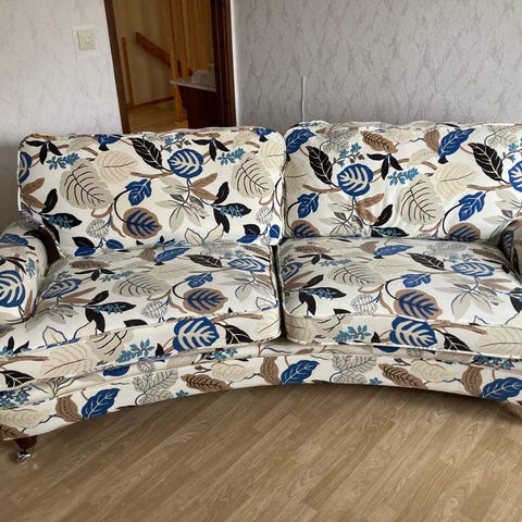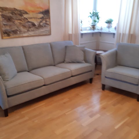 En tresits soffa perfekt för den som uppskattar kvalitet. Alla dynor och kuddar har dragkedja som gör att klädseln är tvättbara. Inga skador på tyget, den är lite mörkare i färgen än på bilderna. Perfekt för den yngre då sitthöjden är ca 40 cm. Nypris 2008 för denna möbel var på 23000kr. Fin svängd form på möbeln som är ett varumärke för Bröderna Anderssons från Ekenässjön