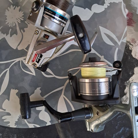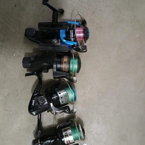 Fyra fiskerullar av olika märken och modeller i blandade färger. Passar för olika typer av fiske. Och dom funkar som de ska .