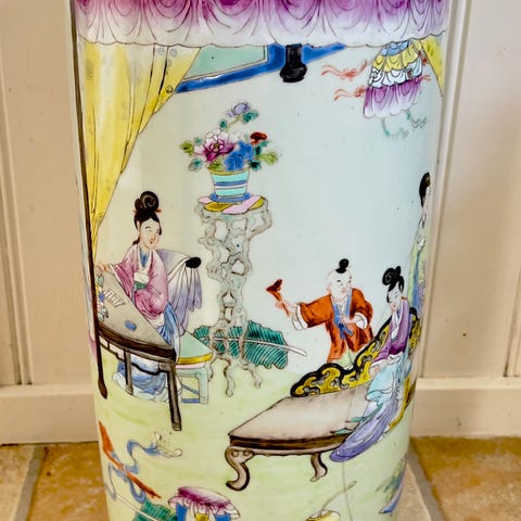 Balusterformad med hänklar i form av buddhistiska lejon, samt med qilindrakar på skuldran, dekor i famille rosefärger av figurscener mot en rikt dekorerad grund. Höjd 100 cm.