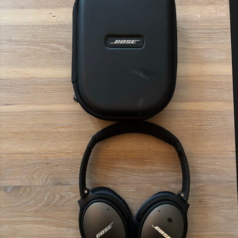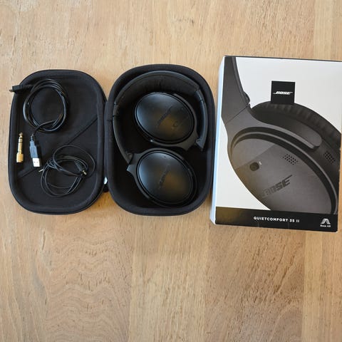 Bose QuietComfort 35 hörlurar. Hörlurarna levereras med ett skyddande fodral.