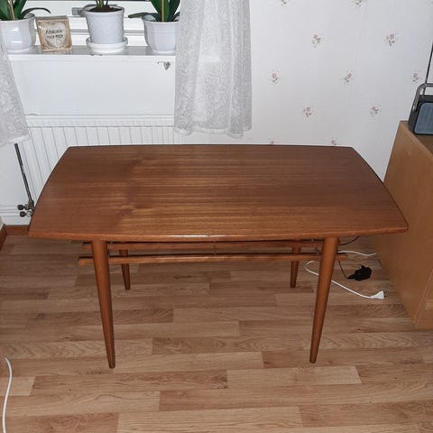 Soffbord i Teak från 1960 tal och Emmaboda möbelfabrik, 850 kr. Mått 145 x 60 cm. Normal höjd. Nån fläck som syns på bild men går nog att leva med. Rengjort , lätt slipat och inoljat. Finns I lokal I Eskilstuna och visas / hämtas där efter överenskommelse
