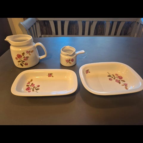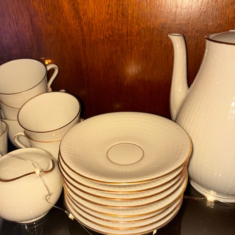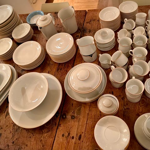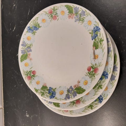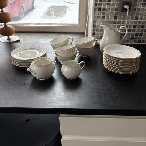 Rörstrand servisdelar med blått och vitt mönster, inklusive tallrikar och skålar med lock. Servisen har dekorativa motiv i blått på vit bakgrund och är tillverkad i porslin.