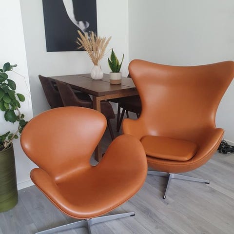 Fritz Hansen Arne Jacobsen Svanen fåtölj i cognac.