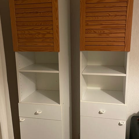 Ikea badskåp med måtten 40 cm bred, 15 cm djup och 95 cm hög. Skåpet har en dörr med tjockleken 16 mm och är tillverkat i brun ekfaner. Inredningen består av flera glashyllor för förvaring av badrumsartiklar.