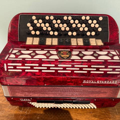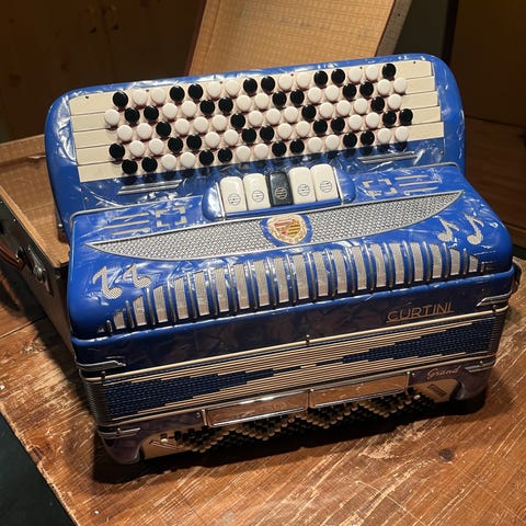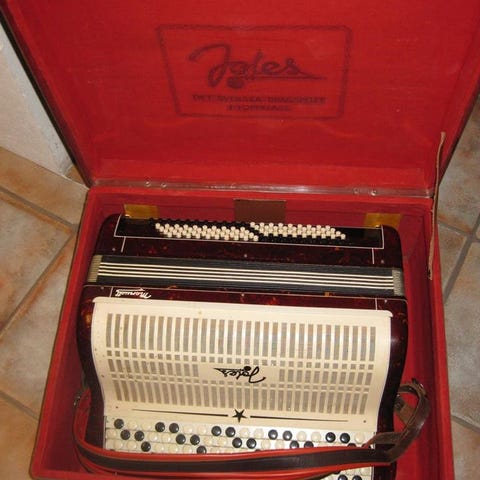Dragspel av märket galanti med tillhörande väska. Produkten är i en ljus färg och har flera knappar och tangenter. Väskan är hård och har ett handtag för transport.