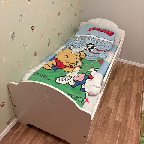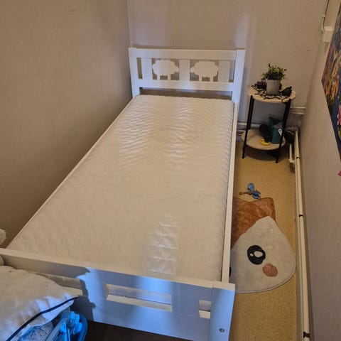 Juniorsäng (70x160 cm) i vit trä med skyddande sidor, anpassad för barn. Sängen har en enkel design med rektangulärt huvud- och fotgavel. Passar som sovplats för barn i junioråldern. Sängen är i fint skick men några skavmärken finns, går att måla i med färg om man vill. Madrass medföljer om man vill, har alltid använts med madrasskydd.
