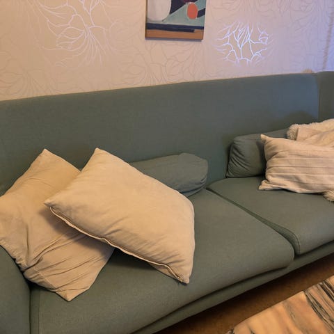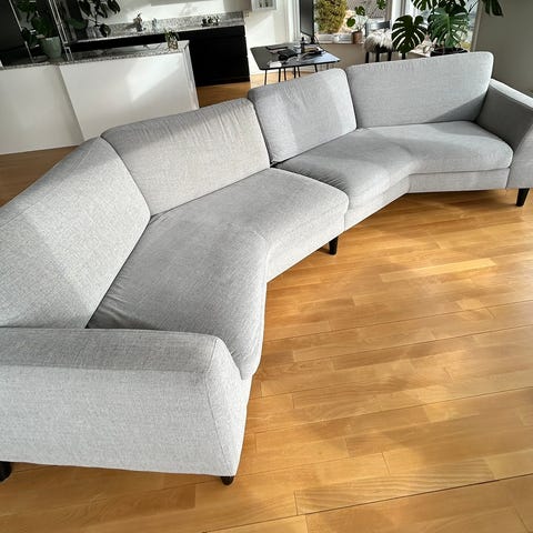 Väldigt skön och praktisk soffa. Den är nytvättad samt djurfri och rökfri. De går att ta av kuddfodralen vid tvättning. Passar bra för både stor och liten familj. Soffan är enkel att monteras.
