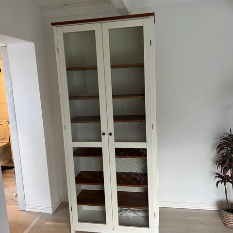 Vitrinskåp från IKEA, ca 20 år gammalt men i fint skick. Smidigt och nätt, dock svårt att skicka med post så bäst att hämta på plats i Höllviken. Möjlighet att komplettera med ljuskälla i taket.