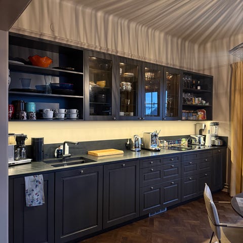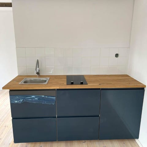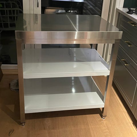 IKEA köksö med gråa skåp och lådor samt svart bänkskiva. Modell Metod. Köksön är utrustad med inbyggt eluttag på sidan för enkel åtkomst. Passar för köksförvaring, extra arbetsyta och ger två stycken sittplatser på ena sidan.