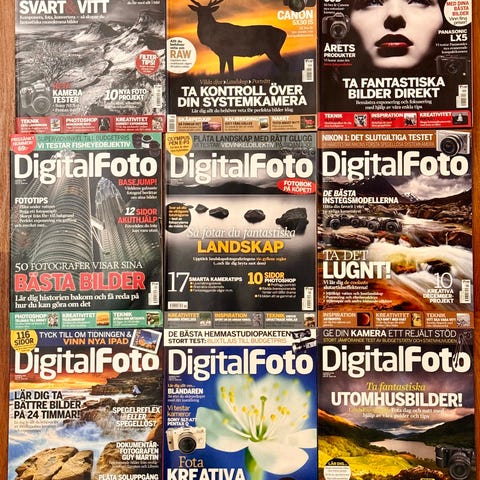 DigitalFoto magasin samling med olika nummer och teman relaterade till fotografering. Innehåller artiklar om kamerateknik, fotograferingstips, objektiv, och bildbehandling. Passar för fotografer och fotointresserade som vill fördjupa sina kunskaper inom digital fotografering.
