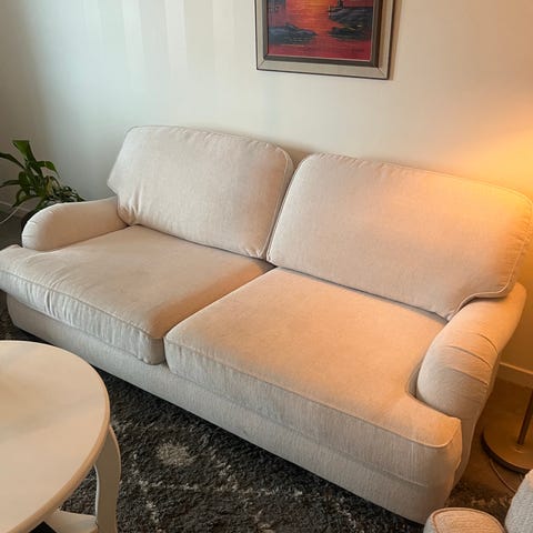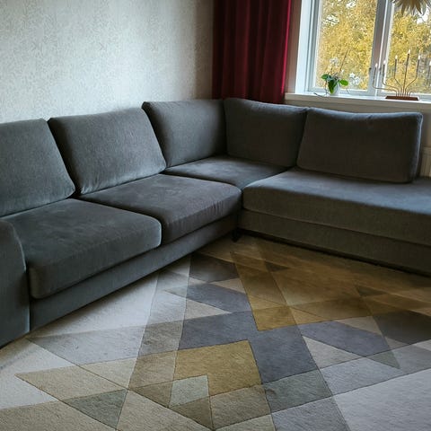 Närbild på tyget samt mått finns bland bilderna. Inköpt 2024 och fortfarande i bra skick. Katt finns i hemmet. Prydnadskuddar ingår ej.