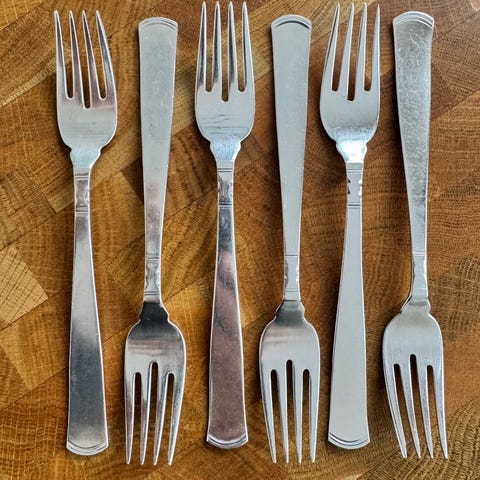 Oanvända Rosenholm silverbestick. Har 2 matskedar, 2 matgafflar, 2 matknivar och 6 moccaskedar.