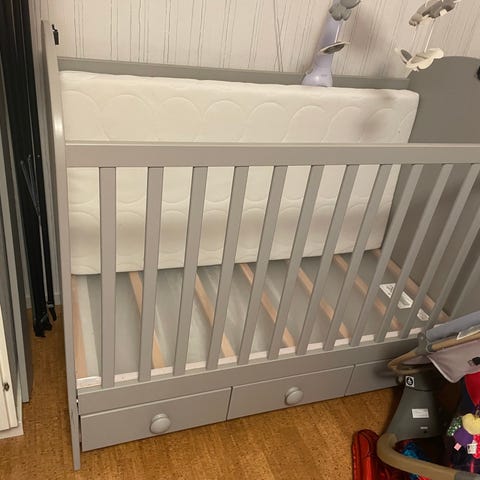 Stadig, säker och stilren spjälsäng som passar perfekt till barnrummet. Allt är väl omhändertaget i rök- och djurfritt hem.