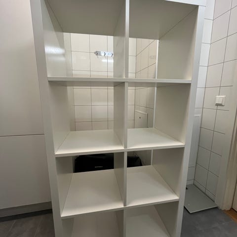 6 st hyllplan med ”stopp” som man kan sätta i valfri höjd. Några mindre skavanker, några mindre skador och någon vattenfläck på en hylla men inget som stör.