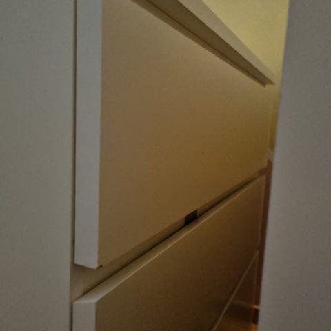 Byrå och hylla staplas på varandra. Staplade på varandra är höjden 180 cm från golvet.