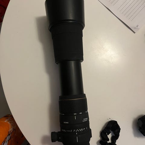 Militärgrönt Sigma Telephoto objektiv med teleobjektivsfunktion. Objektivet är tillverkat i metall och levereras med praktisk och vacker skyddsväska i läder med vackra röda sömmar, med bärrem. 72mm Skylight 1A-Filter. Objektivet är lämpligt för fotografering som kräver längre brännvidd.