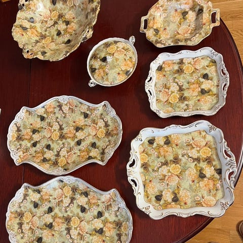 En samling av olika små kaffekoppar med tillhörande fat i porslin. Kopparna har varierande färger och mönster.