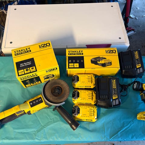 Tactix multimeter och borrmaskin med handtag. Verktygen är avsedda för elektriska mätningar och borrning. Multimetern har display och flera funktioner för mätning av elektriska värden. Borrmaskinen är gul med svart handtag.