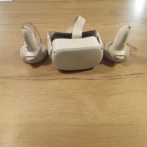 Oculus Quest VR-headset med handkontroller i vitt. Inkluderar headset och två handkontroller. Designad för virtuell verklighetsupplevelse med trådlös anslutning.