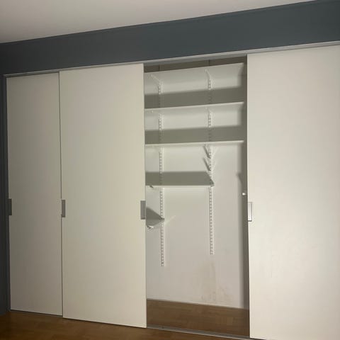 Dörrarna är ca 97 cm var och skenorna (totala bredden) är 190 cm.