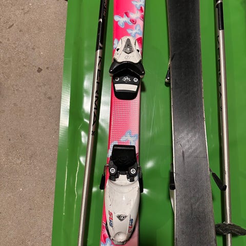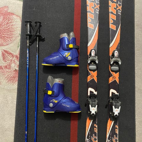 Skidpaket bestående av skidor, stavar, pjäxor i storlek 36 (EU) samt blå skid hjälm.