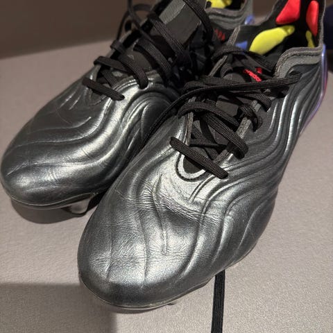 Adidas Copa Mundial fotbollsskor i svart och vitt. Storlek 40 2/3, tillverkade i läder med dobbar för gräsunderlag. Skorna är avsedda för fotboll och har snörning framtill.