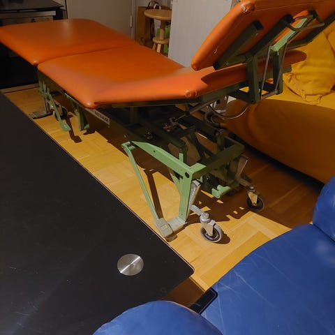 Stabil och bekväm behandlingsbänk i bra skick. Hopfällbar modell med tåligt konstläder och metallstativ. Passar perfekt för massage, skönhets- eller behandlingsverksamhet.