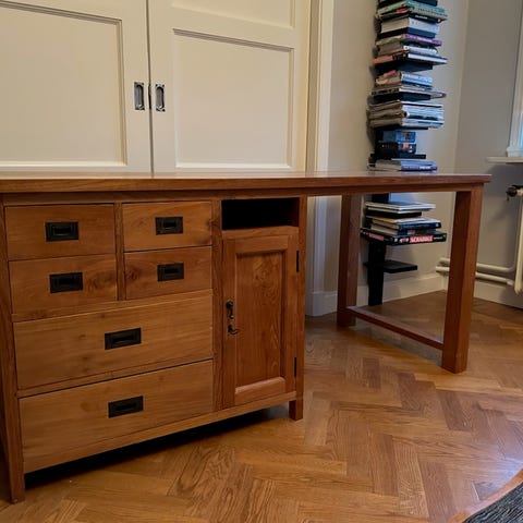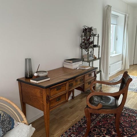 Säljer ett skrivbord i äkta trä (tror det är återvunnet teak). Knappt använt och i mycket bra skick. Praktiska och fina lådor med metallhandtag, stabilt och rejält med bra arbetsyta.