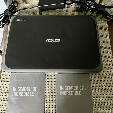 Asus Chromebook laptop i silver färg. Inkluderar laddare. Laptopens exakta modell CX1400CN funkar bra och gör sitt jobb.