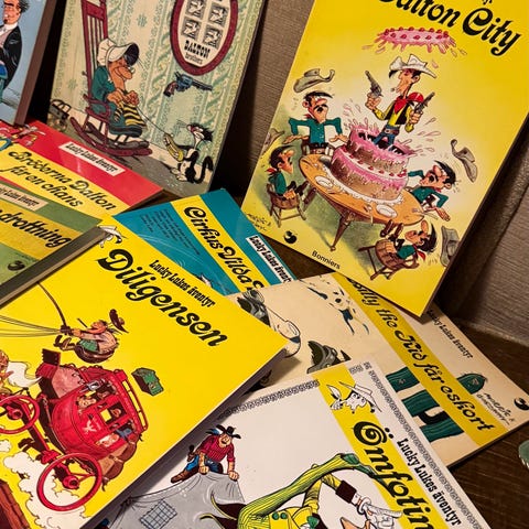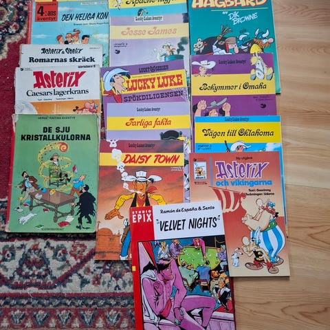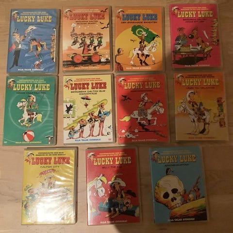 Komplett samling av Lucky Luke-album på svenska från 1946 till 1991. Det är en raritet som är perfekt till samlare eller Lucky Luke fans.
