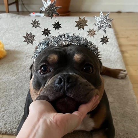 Hemma är han en knä hund och världes mysigaste att gosa med.
