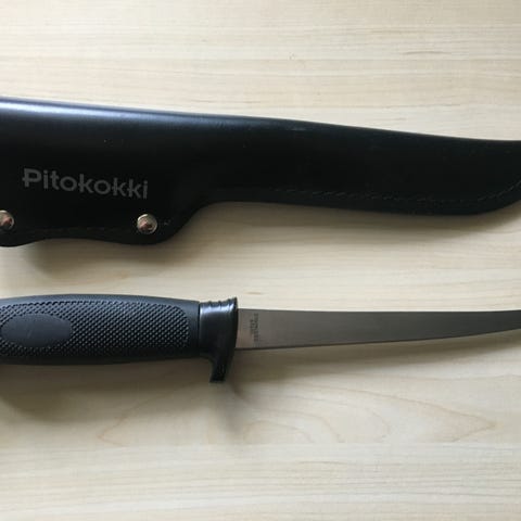 Flytende Fiskekniv i trä med inbyggd linjal och öppnare. Kniven är utformad för fiskeändamål och har en praktisk design som kombinerar knivblad och måttstock i ett verktyg. Knivbladet är 9cm långt. Den är oanvänd och inköpt i mitten av 70 talet i Norge.