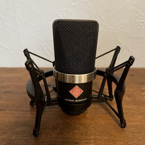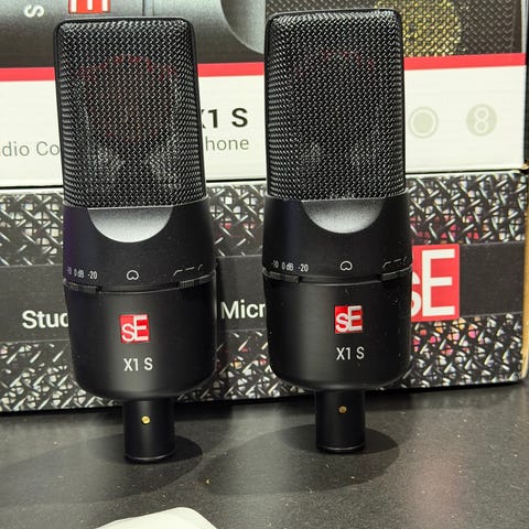 Två grymma mikrofoner. Påminner om Neumann 103:or. Ingår två dyra shockmount och puffskydd.