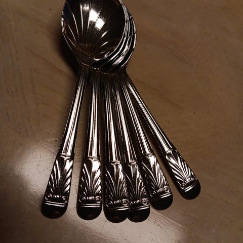 Fem matskedar i serien ”Pärlemo”i rostfritt stål.