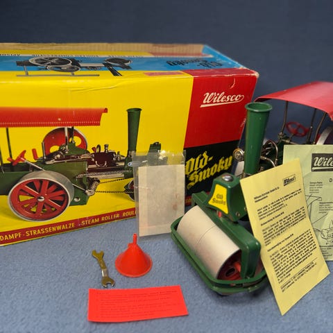 En leksaks ångvält tillverkad i metall.