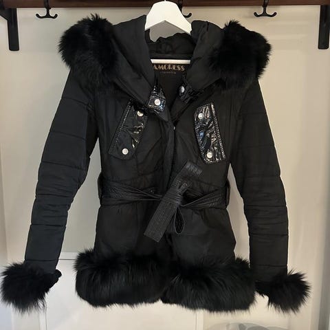 Svart vinterjacka från Garoff med fuskpäls längs kragen och på insidan av jackan.